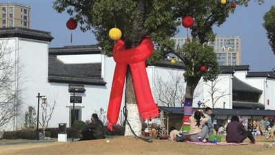 闲林居地标附近,一棵高大的乌桕树挺拔而立,枝头点缀着红灯笼,格外醒目。唐初余杭县令张士衡的铜像面前,巨大的福字装置暖意十足,毛茸茸的质感,引得不少孩子倚靠上去玩耍。“老街的年味特别浓,孩子们玩得不亦乐乎,听说过年期间这里每天都有表演,我们打算常来逛逛。”市民于丽萍说。